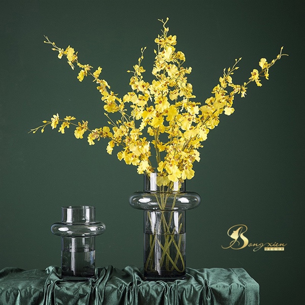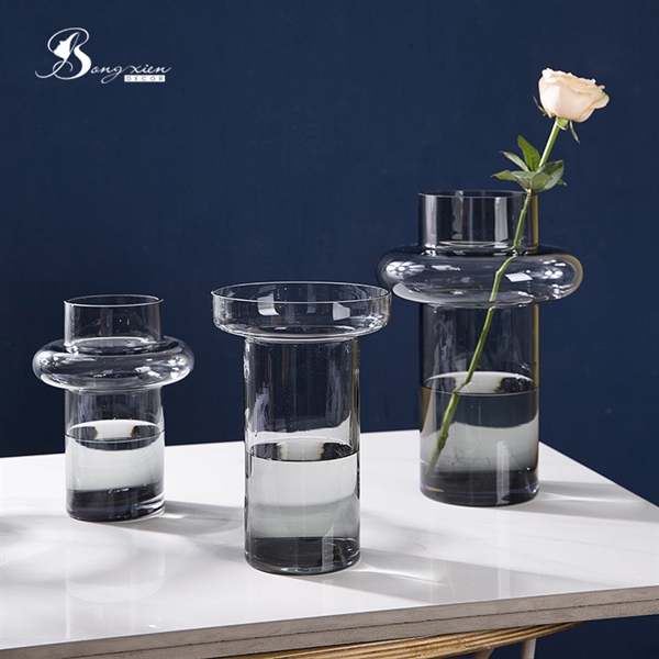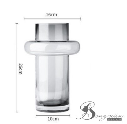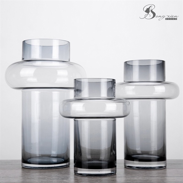 Binh thuỷ tinh màu xám trong,thiết kế kiểu dáng lạ mắt với phần thân hình trụ và phần cổ bình phình tròn, vừa độc đáo vừa hiện đại.